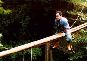 安全帯をつけ、橋を渡るアイアン・バール鈴木。