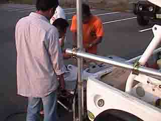 試乗会自体は南極の計画を主なテーマとしたものではなかったが、参加者の関心が高いことも有って、試乗会終了後に引き続き行う予定で持って行っていた風車を組み上げて、南極で行うのと同じ様に「SJ2001」号に取り付け、皆の前に披露した。
