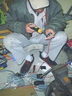 風力発電機からコントローラーへ入る配線を製作する上坂さん。