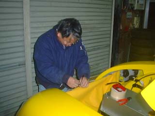 谷口社長はモーターの周囲に、雪の進入を防ぐ為の布を貼り付ける作業に余念が無い。