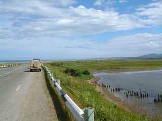 ![]() スタロドゥプスコエは、旧名「栄浜」と言って、宮沢賢治の「銀河鉄道の夜」に縁の有る場所だ。 写真は「白鳥湖」と呼ばれる湖で、「銀河鉄道」最初の停車場所だと言われる。 ![]() 右が「白鳥湖」。 左手がオホーツク海だ。 州都ユジノから1時間弱のこの辺りまでは舗装も比較的綺麗で、巡航速度は100km/hを越える。 ![]() これがオホーツク海と白鳥湖を繋ぐ水路。 海岸線では琥珀が拾えるらしい。 ![]() この日の遅い昼御飯を頂いた「カフェ」の女コックさん。 「働かざる者喰うべからず」の元共産国家らしく、女性だってちゃんと金を稼いで家に入れる。 レーニン万歳!! |